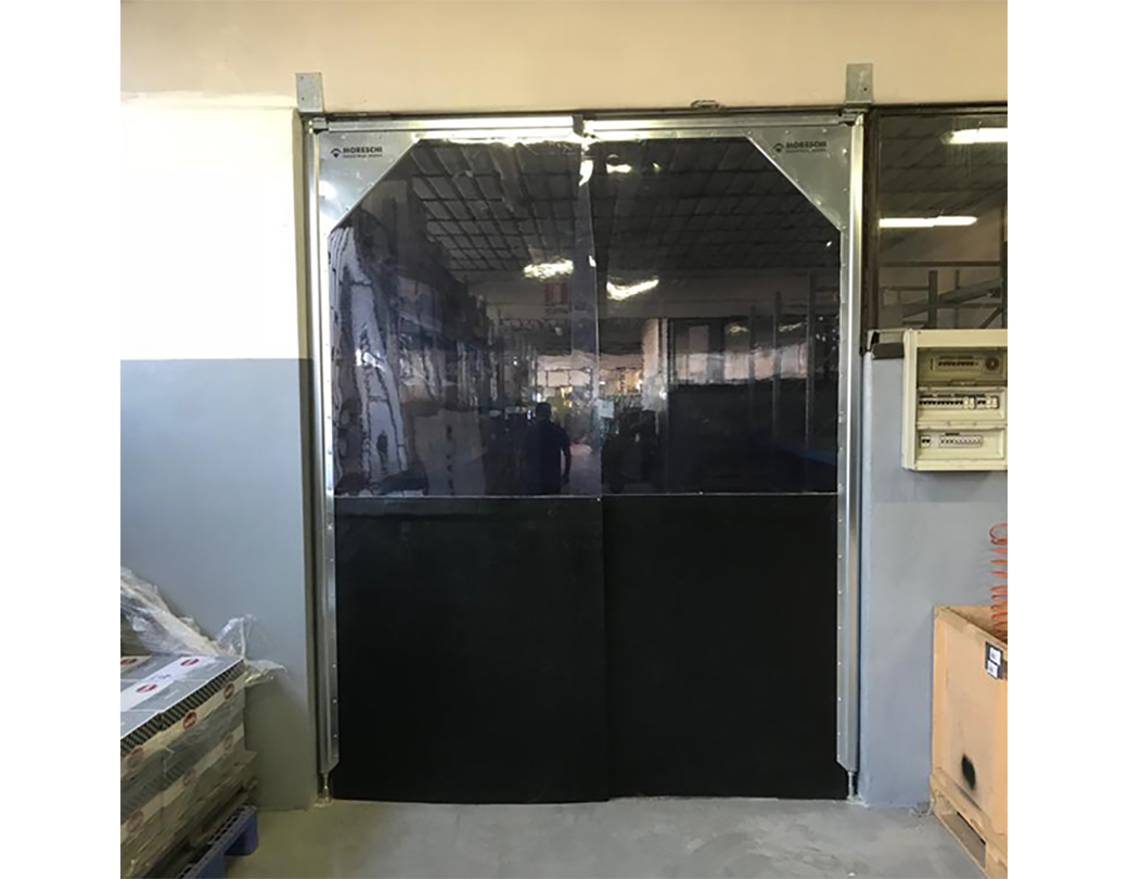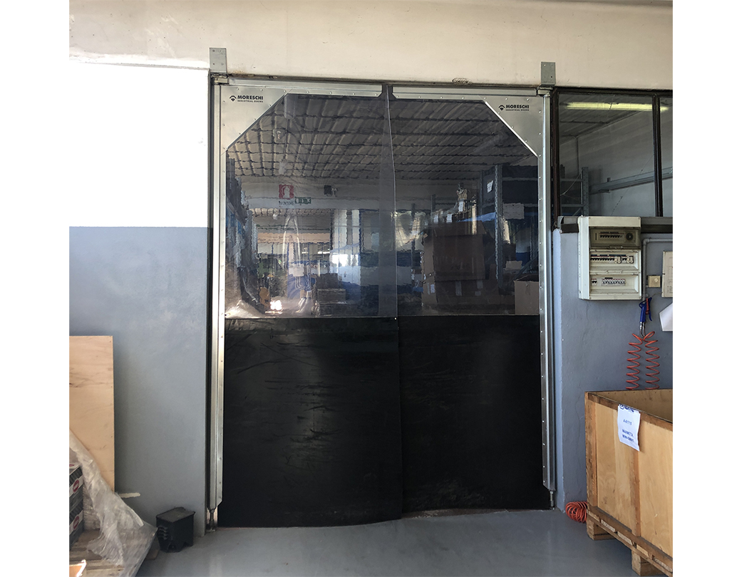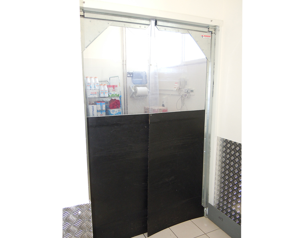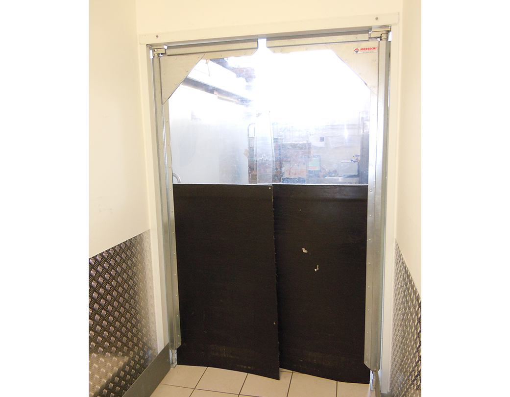 The doors are made with a bearing structure in galvanized steel profile, cold bent with monolithic structure. Each door leaf is equipped with an opposing arm closing device with adjustable force torsion spring incorporated in the supporting structure. The hinges rotate, in the lower part, on steel balls and, in the upper part, within a seat with self-lubricating bushings. The flexible panels are made of top quality materials specifically designed to guarantee maximum resistance and durability even in very severe conditions. P.V.C. are used (Polyvinyl chloride) with the addition of plasticizers that make it possible to use it even at low temperatures (down to -35°C) while maintaining the characteristic of transparency and resistance to impact and abrasion. Black anti-abrasive rubber with alternative Curtain inserts to increase tear resistance. The door can only be installed in the passageway light compartment.