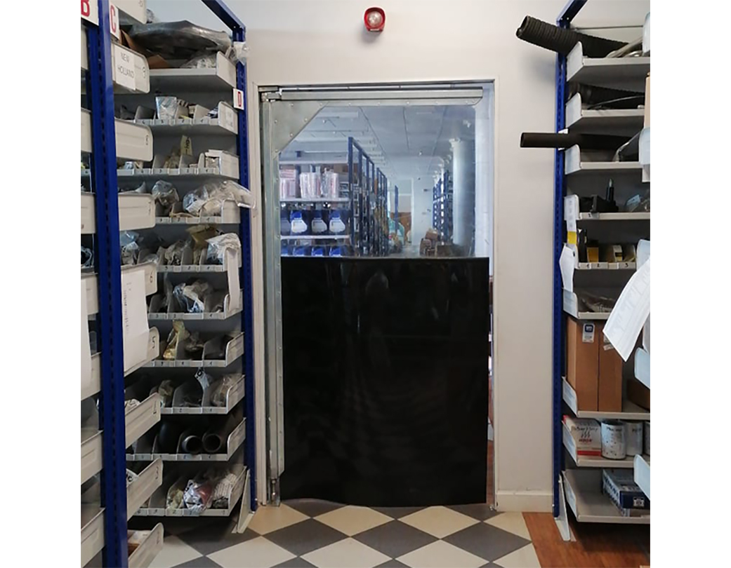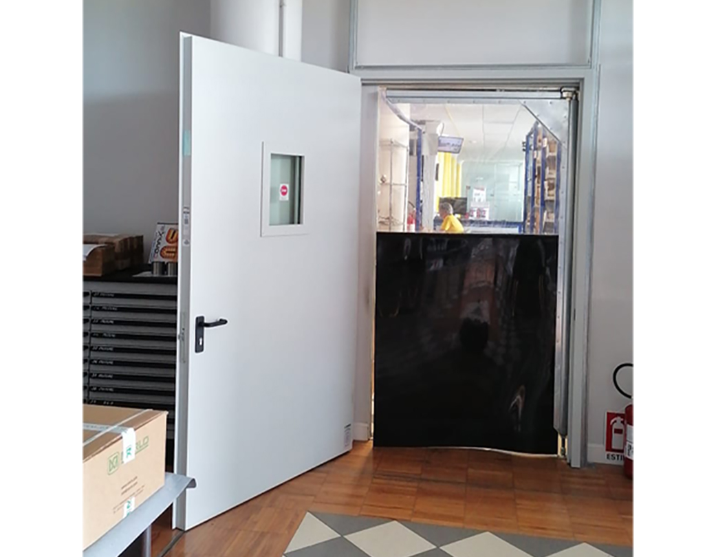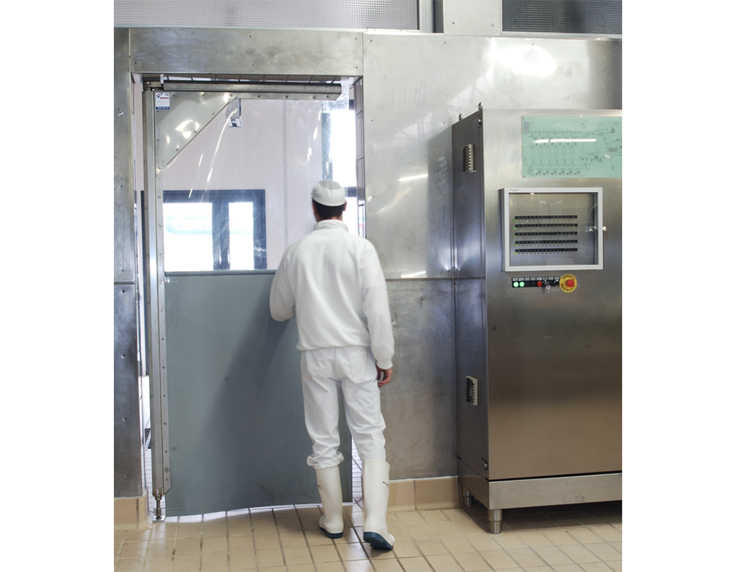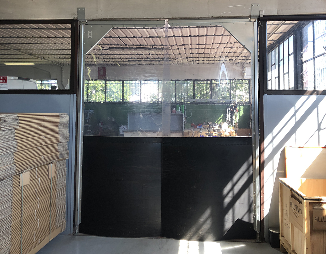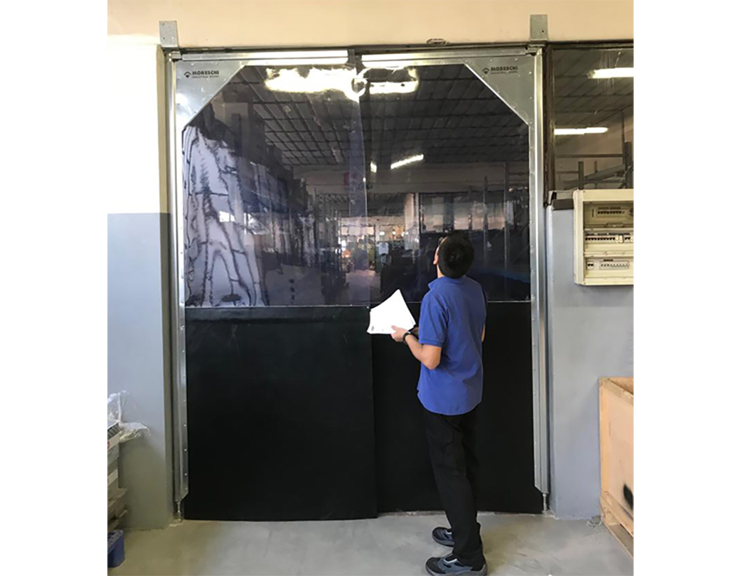 The doors are made with a bearing structure in galvanized steel profile, cold bent with monolithic structure. Each door leaf is equipped with an opposing arm closing device with adjustable force torsion spring incorporated in the supporting structure. The hinges rotate, in the lower part, on steel balls and, in the upper part, within a seat with self-lubricating bushings. The flexible panels are made of top quality materials specifically designed to guarantee maximum resistance and durability even in very severe conditions. P.V.C. are used (Polyvinyl chloride) with the addition of plasticizers that make it possible to use it even at low temperatures (down to -35°C) while maintaining the characteristic of transparency and resistance to impact and abrasion. Black anti-abrasive rubber with alternative Curtain inserts to increase tear resistance. The door can only be installed in the passageway light compartment.