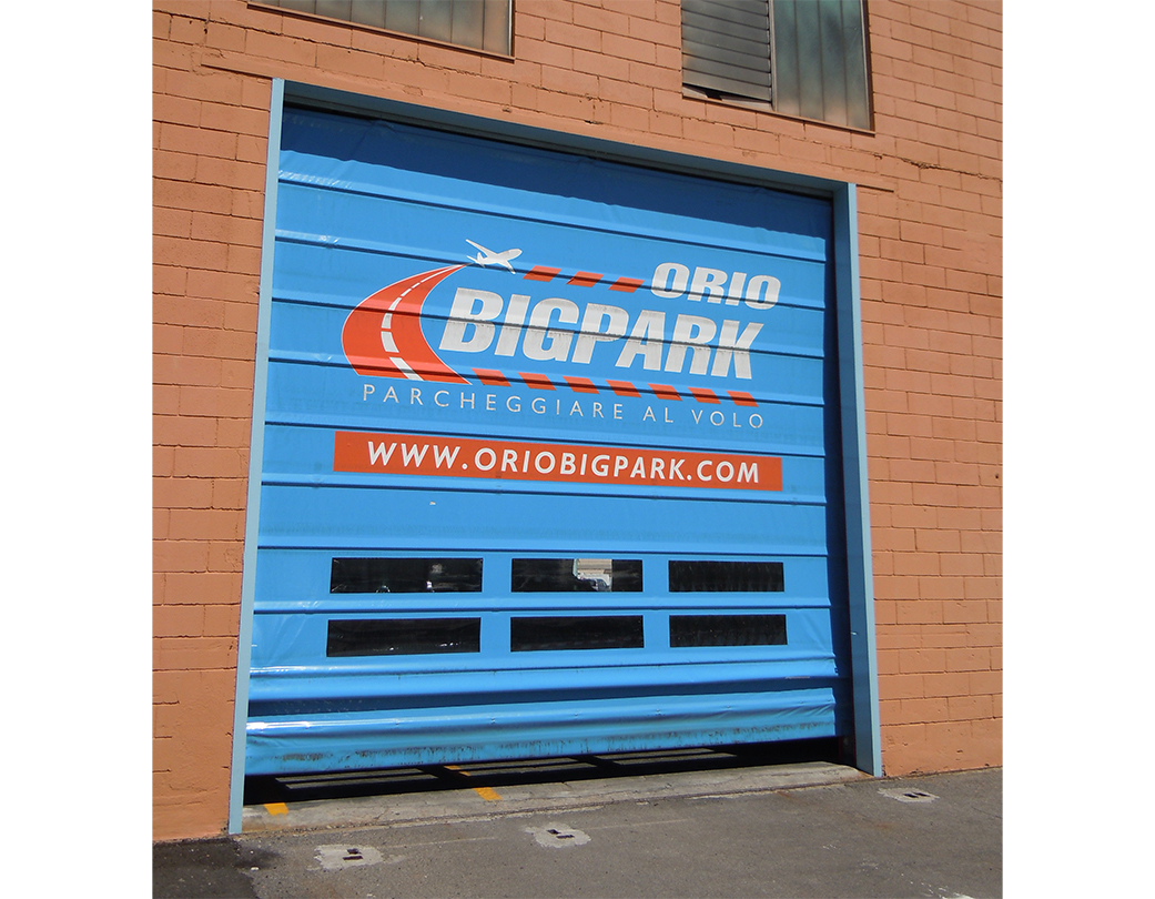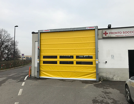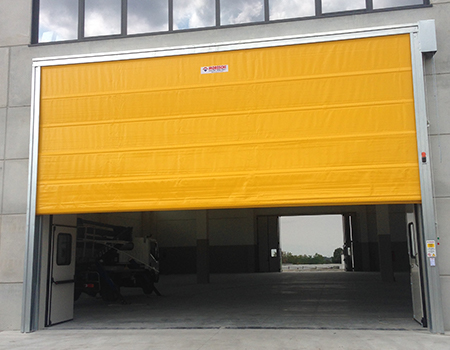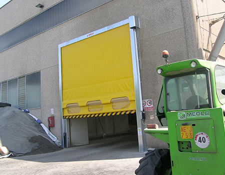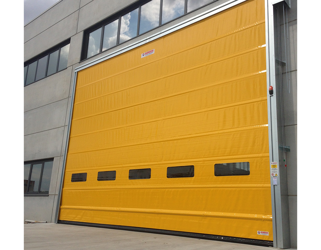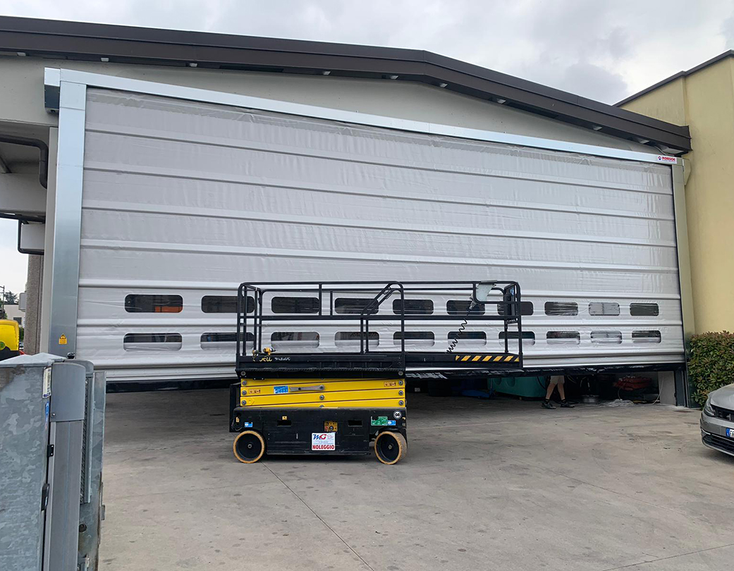 FOLDING RAPID door consisting of self-supporting metal structure with galvanised steel finish and wear-proof rubber profiles for sliding surface; rotation shaft on bearings; 400/230 V three-phase power supply operating unit with electromagnetic brake; limit switch unit; positioned on the sides. Motor cover in galvanised sheet steel; protected transmission elements; electrical system with flame resistant cables CEI 20-22-II; anti-crushing safety (UNI EN 12453): infrared photocell transmitter-receiver unit; inductive type inductive edge via radio with self-test; with flexible tear-proof PVC fabric sheet. Switchboard in IP 66 plastic case, programmable operating logic (automatic, semi-automatic, man present), 230/400 V three-phase, 50 Hz power supply, 24 V low voltage auxiliaries. Opening push-button on the panel and n°01 separate open/stop push-button panel. Device for manual opening and closing from ground with safety micro and crank handle in absence of voltage.