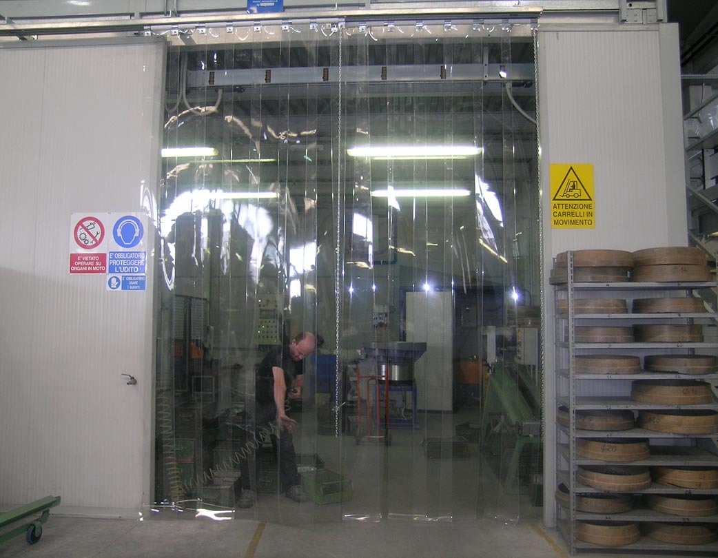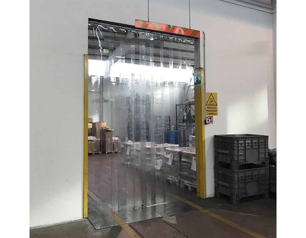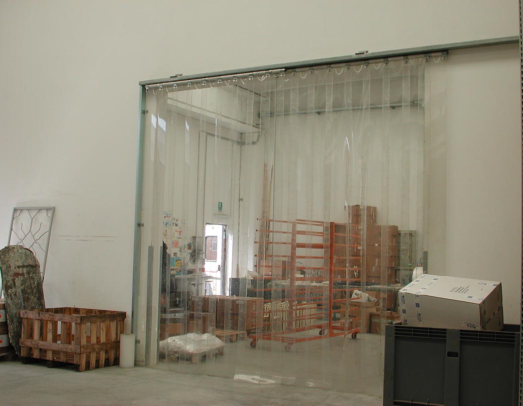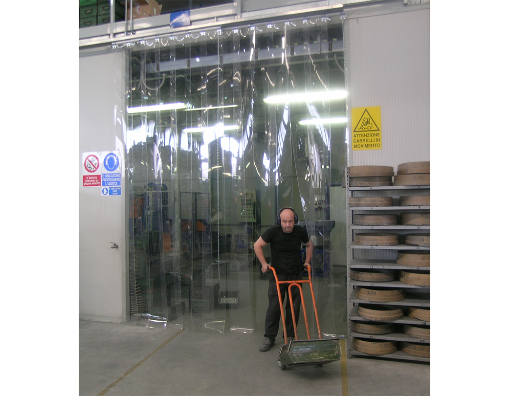 Door with flexible PVC strips made by extrusion, with rounded edges anchored in the upper part to mobile galvanised steel sheet jaws. The overlap of the strips is determined by the conditions under which they are used, with widths of 200, 300 and 400 millimetres.