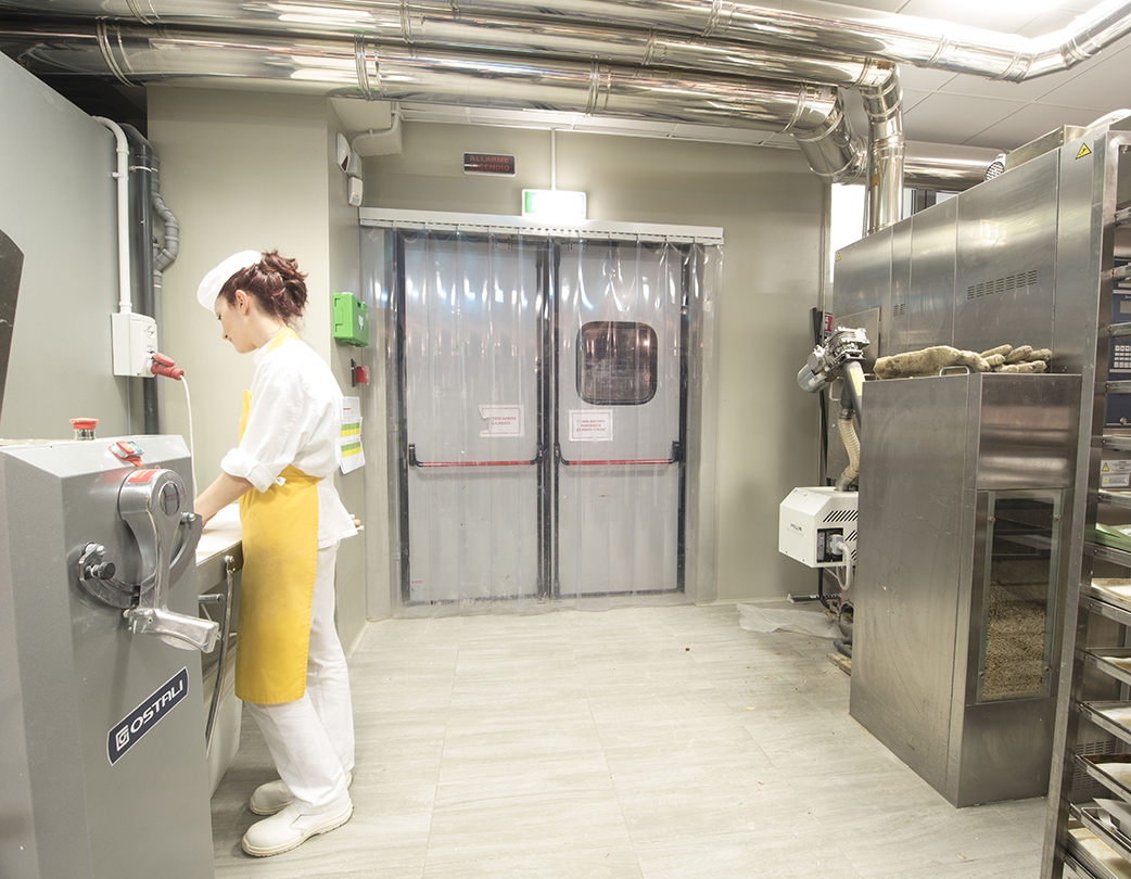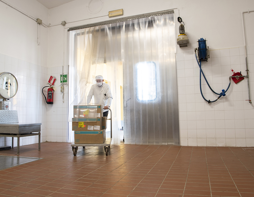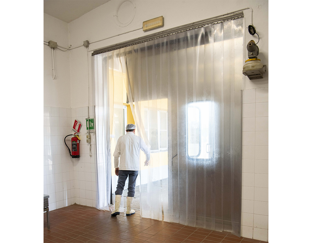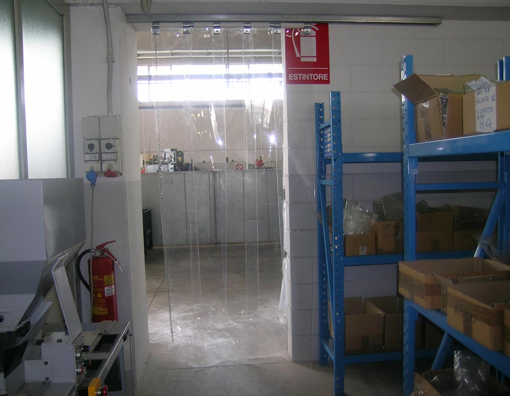 Door with flexible PVC strips made by extrusion, with rounded edges anchored in the upper part to mobile galvanised steel sheet jaws. The overlap of the strips is determined by the conditions under which they are used, with widths of 200, 300 and 400 millimetres.