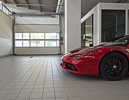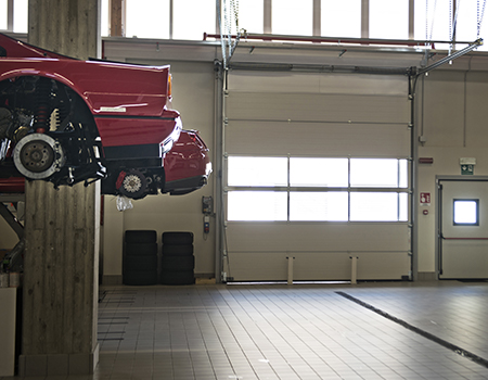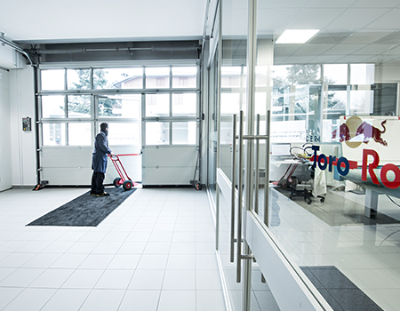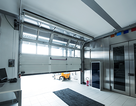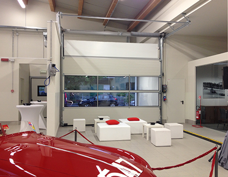 The sectional glazed aluminium sectional door, with its upward sliding solutions, optimises side and workspace spaces. It gives brightness to the interior spaces and elegance to the rooms.