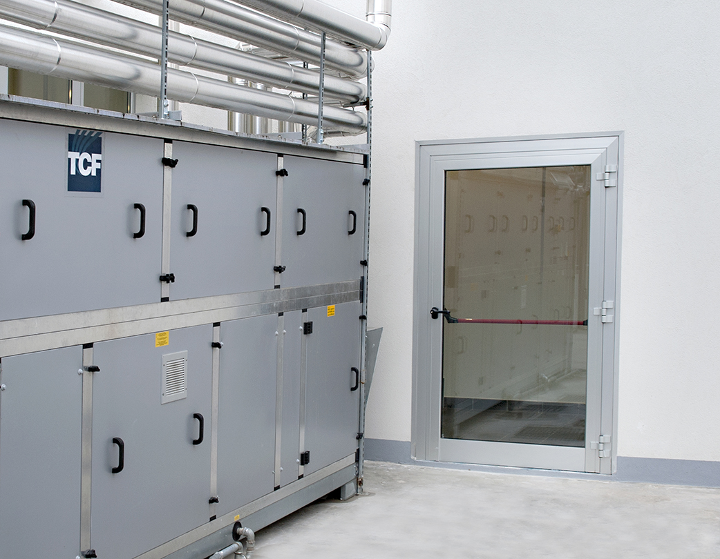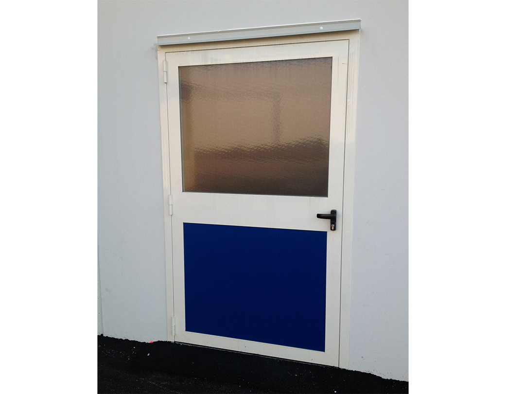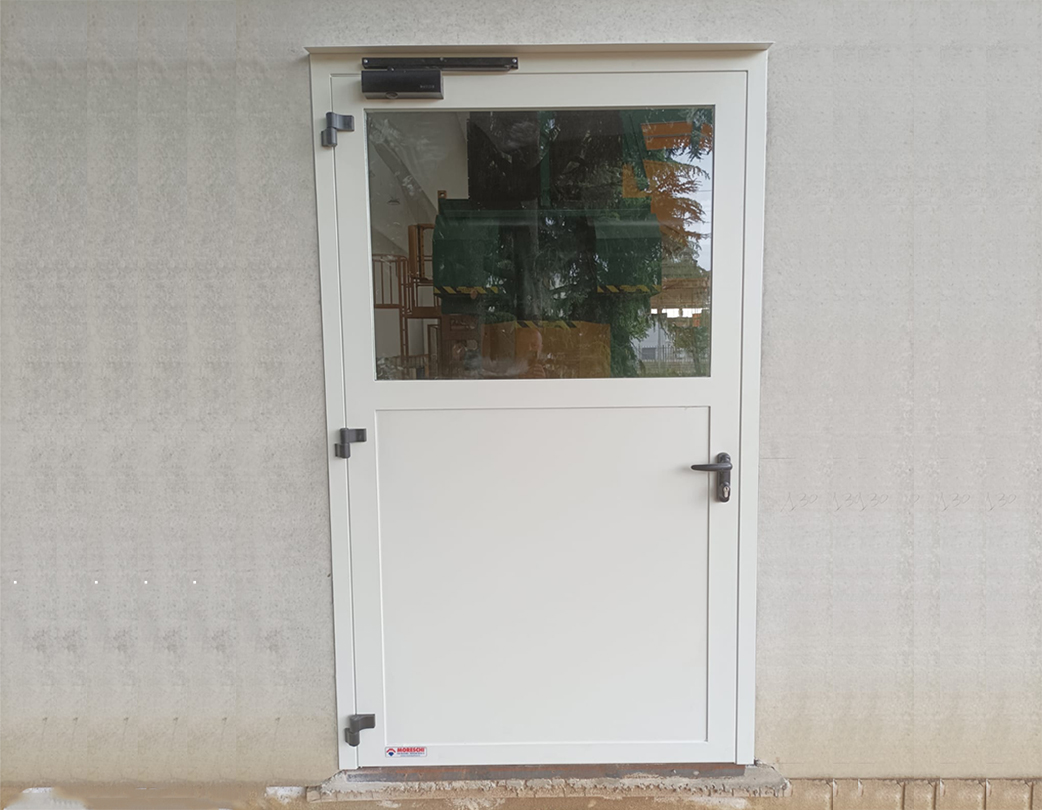 Door consisting of containment aluminium profiles and perimeter aluminium rebate frame, with seat for seals anchored to the wall compartment by means of expansion plugs. The door leaf is fitted with glass of any type and finish (double glazing, safety glass, transparent, satin-finish, etc.) with a maximum total thickness of 40mm. The hinges and handle are in black painted aluminium alloy. In the case of outdoor installation, in the upper part of the frame, a special aluminium profile, suitably siliconised, is installed; this will guarantee resistance to water infiltration. In the case of installations in compartments not suitable to receive doweled doors, provide for the use of a counterframe with walling clamps, in tubular black steel dim.40x15x1,5.