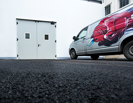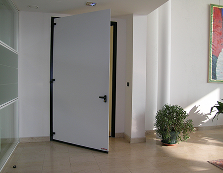 The door consists of 52 mm thick doors. 20/10 thick galvanised steel perimeter frame, painted black, with anti-spatter gasket seat, anchored to the wall compartment by means of expansion plugs: the doors are completely covered with smooth or peeled sheets obtained by continuous rolling process, in galvanised steel SENDZIMIR system, followed by phosphating and the application of 5 Micron thick primer on both faces. On the external side is applied the finishing varnish with a thickness of 20 Micron. The surface thus obtained is completely smooth. This pre-painting offers, without any alteration, the resistance of 400 hours in a salt spray chamber. Finally, we prevent scratches by applying adhesive film to be removed after installation.