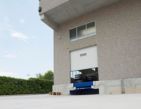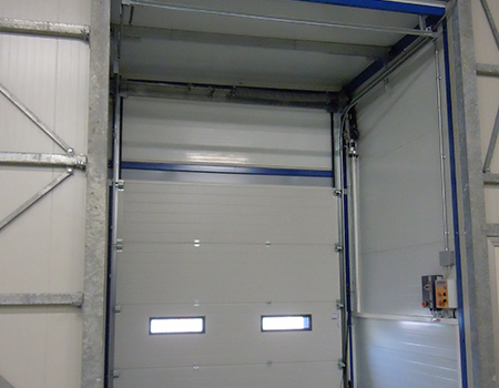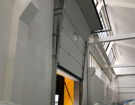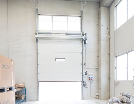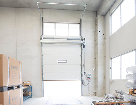 The sectional door opens upwards by sliding internally in special side guides of minimum dimensions, thus guaranteeing ample manoeuvring space for handling.