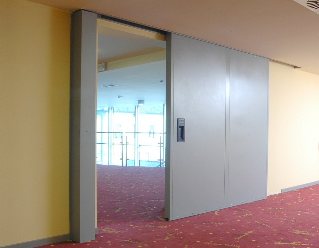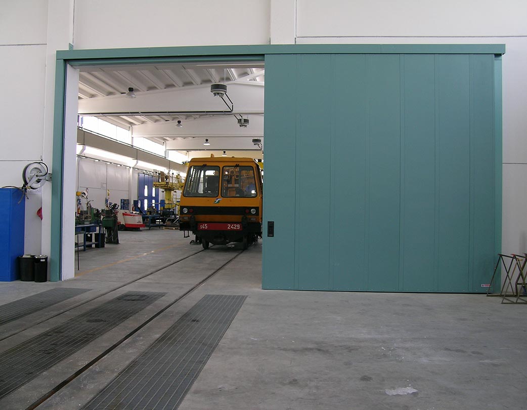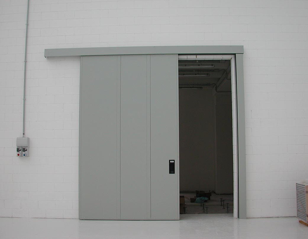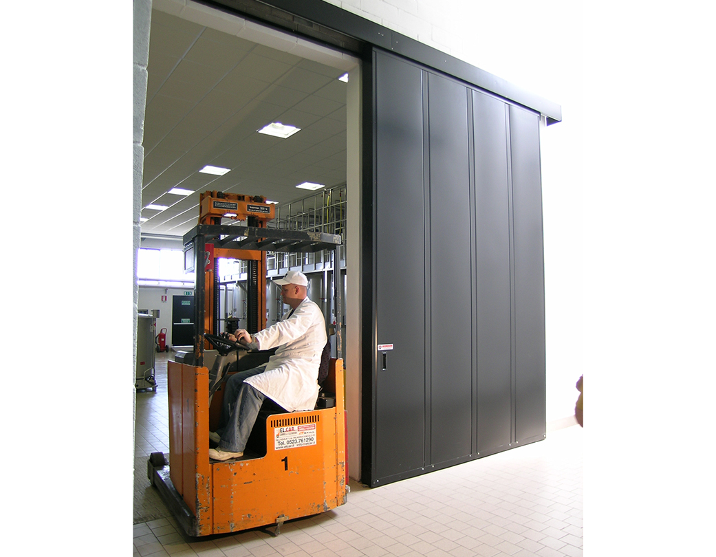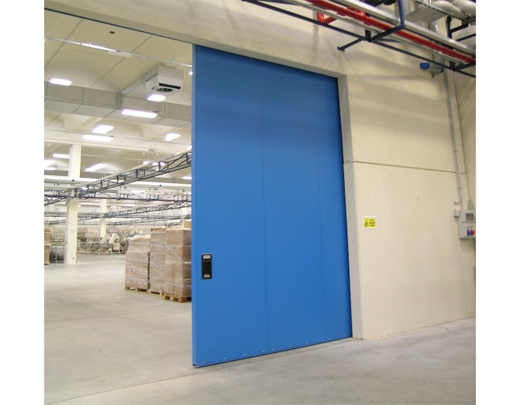 Porte coulissante coupe-feu EI2 120 Norme CE selon UNI EN 16034: 2014 et 13241: 2003 + A2: 2016. Panneaux en tôle d' acier moulée sous pression , électrosoudés et isolés à l'intérieur avec un pack isolant haute densité; épaisseur totale du vantail 82 mm (de légères déformations des panneaux peuvent se produire) .Rabbet debout avec boîte de guidage et contrepoids, qui assure la fermeture en cas d'incendie; labyrinthes ignifuges placés sur le périmètre; guide supérieur complet avec supports spéciaux pour montage sur architrave en béton armé; joint périmétral thermo-expansible ; la porte n'utilise pas de guidage au sol, la perpendicularité est maintenue par un galet de guidage inférieur. Coulissant avec roues montées sur double roulement à billes; inspection facile de tous les mécanismes de mouvement; normalement équipé d'un dispositif de fermeture automatique au moyen d'un contrepoids. Finition de surface avec de la poudre époxy polyester gaufrée RAL 7035. Sauf accord ou indication contraire dans l'offre, la porte est livrée en standard avec des amortisseurs de fin de course et / ou continus conformément à la loi 81/08. Porte de secours à faible trafic. Les portes sont normalement équipées d'un dispositif de fermeture automatique au moyen d'un contrepoids, activé par un fusible thermique (calibré à 68 ° C) ou un électroaimant.